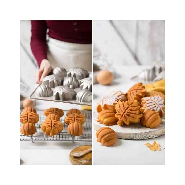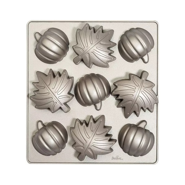 Stampo antiaderente autunno: stampo in alluminio pressofuso ed anti-aderente, ideale per cuocere 9 dolci monoporzioni, forme di dolci autunnali, 4 foglie e 5 zucche da Decora