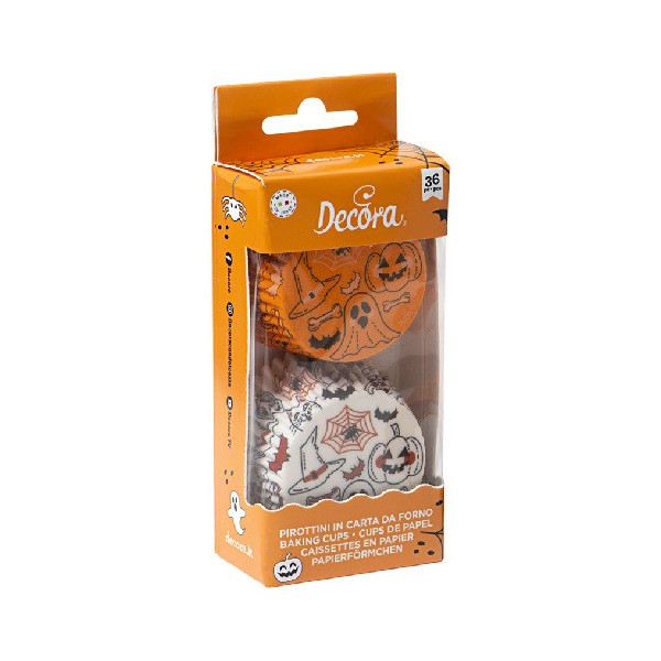 36 Pirottini muffin Pumpkin & Ghost o zucca e fantasma in carta forno antiaderente, di diametro 5 cm altezza 3,2 cm da Decora. Ideali per cuocere, presentare e regalare piccoli dolcetti.