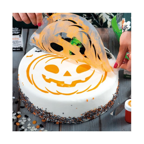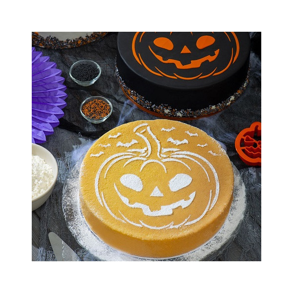 La mascherina Zucca di Halloween è ideale per disegnare su torte e dolci usando ghiaccia reale, crema al burro, zucchero a velo, cacao, spray colorati o aerografo.