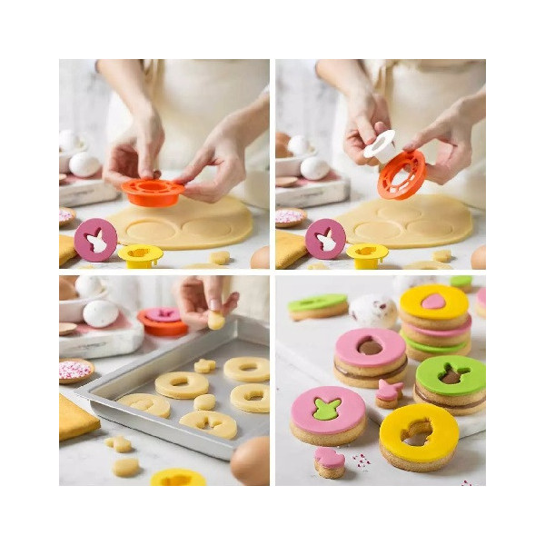 Set taglia-biscotti mix & match pasqua: 4 stampi in plastica ideali taglia-biscotti occhio di bue da 6xh2,2 cm, con il centro una forma a tema pasqua.