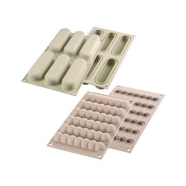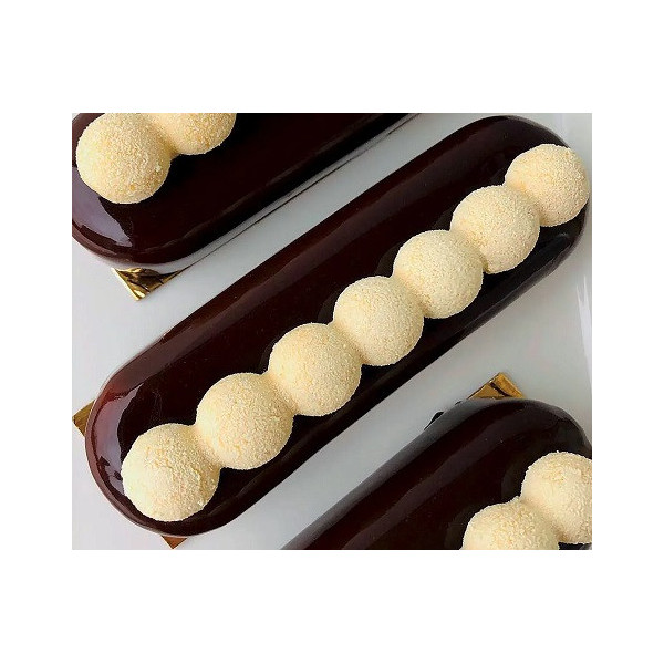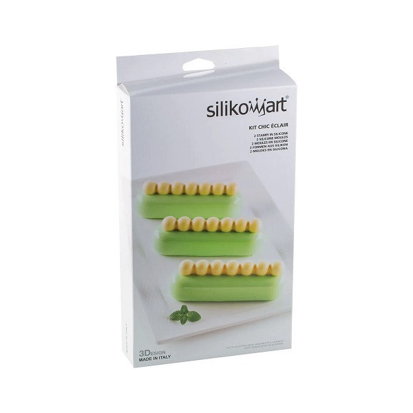 Il Kit Chic Éclair, da Silikomart, è composto da 2 stampi della linea 3D Design in silicone grigio per innovativi pasticcini a forma allungata con effetto tridimensionale da 13x3,8xh4,6 cm, con uno speciale decoro a piccole sfere .