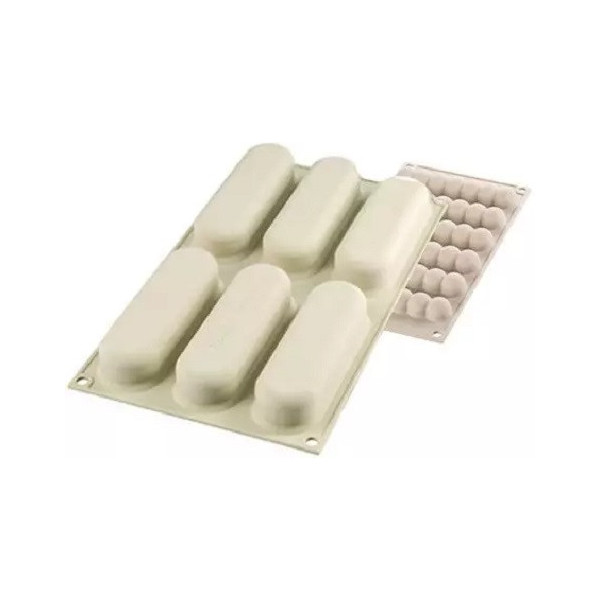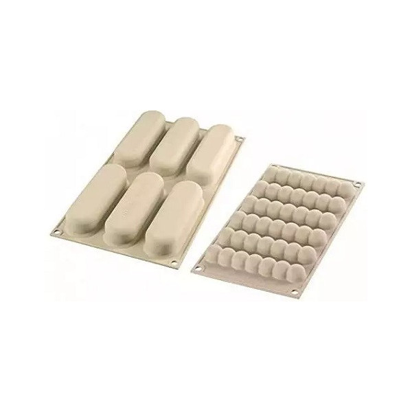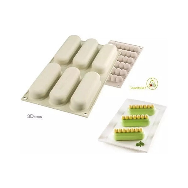 Kit Éclair 80: stampo in Silicone bianco 3D da Silikomart per pasticcini allungati tridimensionali lunghi 13 cm ed alti e larghi 2,5 cm + cutter per inserti e basi + 10 piattini per presentazione