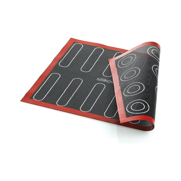 Grazie alle impronte riportate su entrambe le facce questo tappeto per cottura micro-forato in Silicone è ideale sia per la cottura di choux e mini choux (lato A) ed éclairs (lato B), ma anche biscotti, petits-fours, pane e pizza.