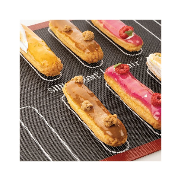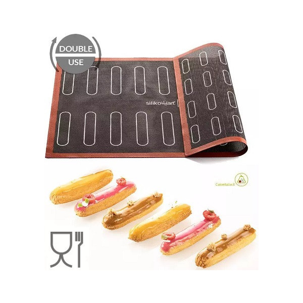 Grazie alle impronte riportate su entrambe le facce questo tappeto per cottura micro-forato in Silicone è ideale sia per la cottura di mini éclair (lato A) ed éclairs (lato B), ma anche biscotti, petits-fours, pane e pizza.
