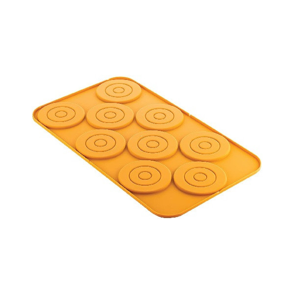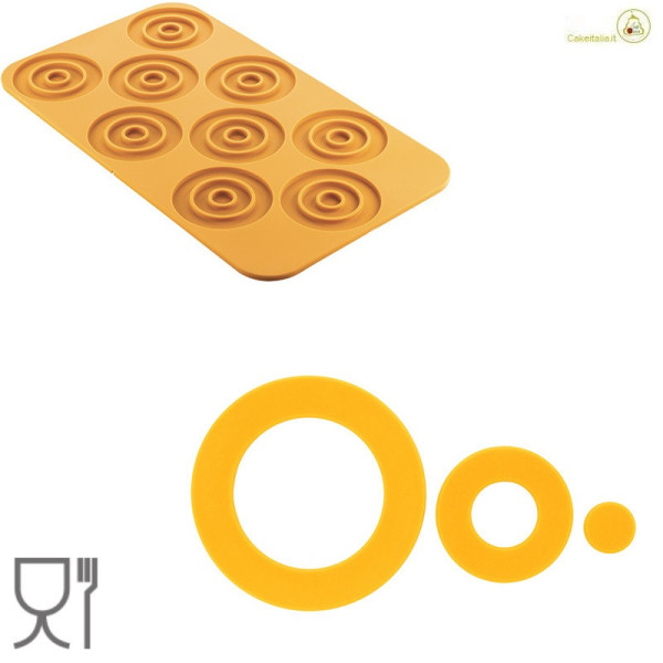 Stampo Cerchio 3.0 o 4.0 in silicone giallo Silikomart: 9 impronte di 3 anelli di diametri 2,2 / 5,8 e 10 cm o di cerchi da 10 cm suddivisi in 4 spicchi, ideali per decorare.