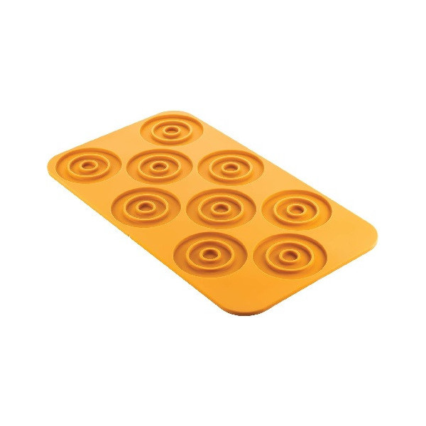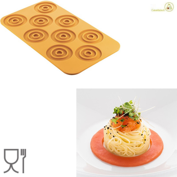 Stampo Tortellino 20 in Silicone giallo di Silikomart; 8 impronte a forma tortellino diametro 5,4 cm ed altezza 2,2 cm, ideali per preparazioni a tema sia dolci che salate in versione cotte o semifreddi.