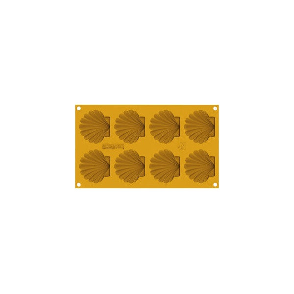 Stampo Canestrello 15, in silicone giallo Linea Naturae di Silikomart, da 8 impronte di o conchiglia di san Giacomo o Capasanta, ideali per decorare preparazioni sia dolci che salate in versione cotte o semifreddi.