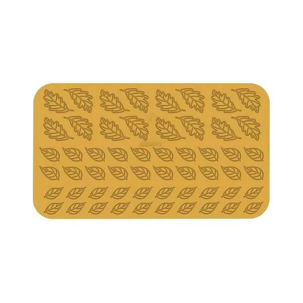 Stampo Foresta, in Silicone giallo Linea Naturae di Silikomart, da 21 impronte di 2 tipi di foglie di foresta ideali per decorare preparazioni sia dolci che salate in versione cotte o semifreddi.