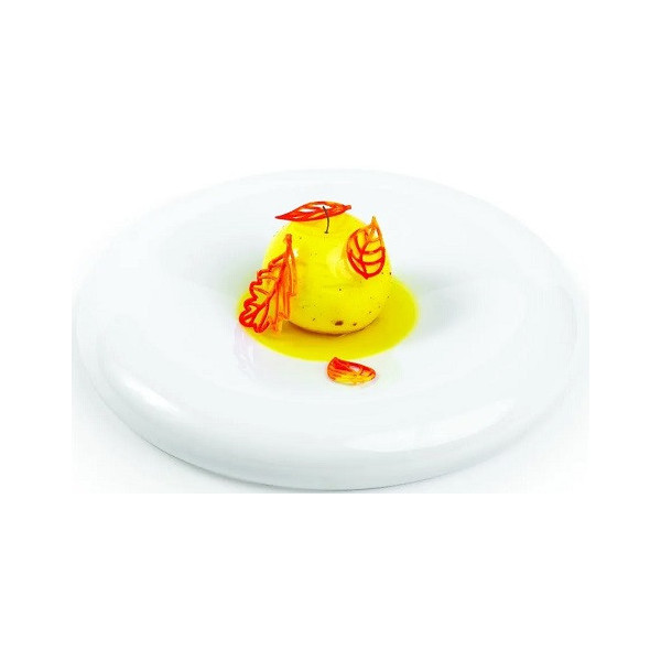 Stampo Piatto 80, in silicone giallo Linea Naturae di Silikomart: 6 impronte a forma di piattino tondo per decorare preparazioni sia dolci che salate in versione cotte o semifreddi.