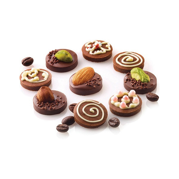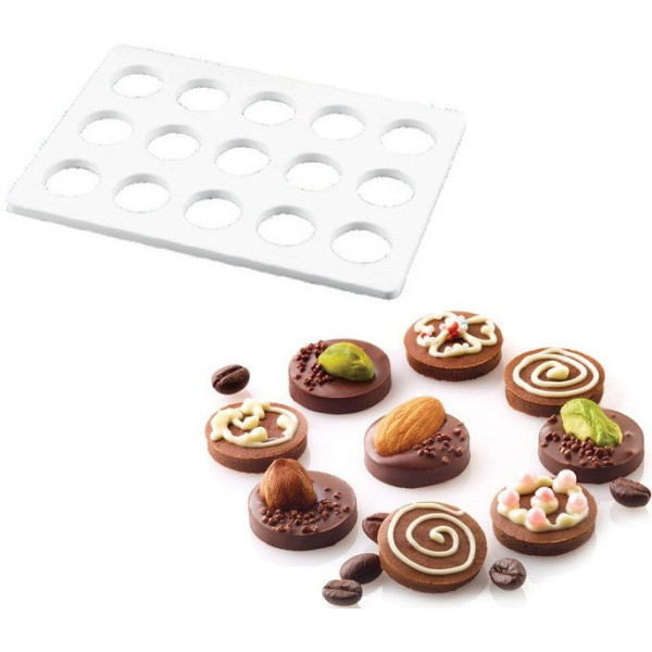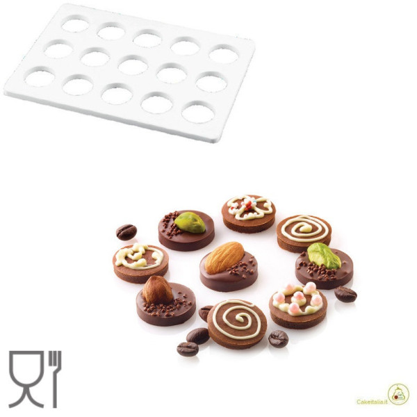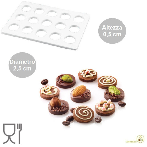 Tappetino Chablon di Silikomart: cola l'impasto nello stampo in silicone, livella e ottieni 15 mini dessert, dolcetti, biscotti o decorazioni di diametro 2,5 cm a forma mini tonda.