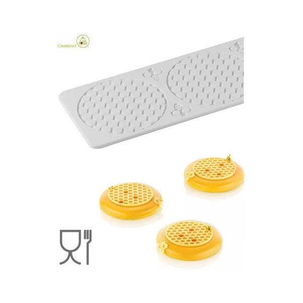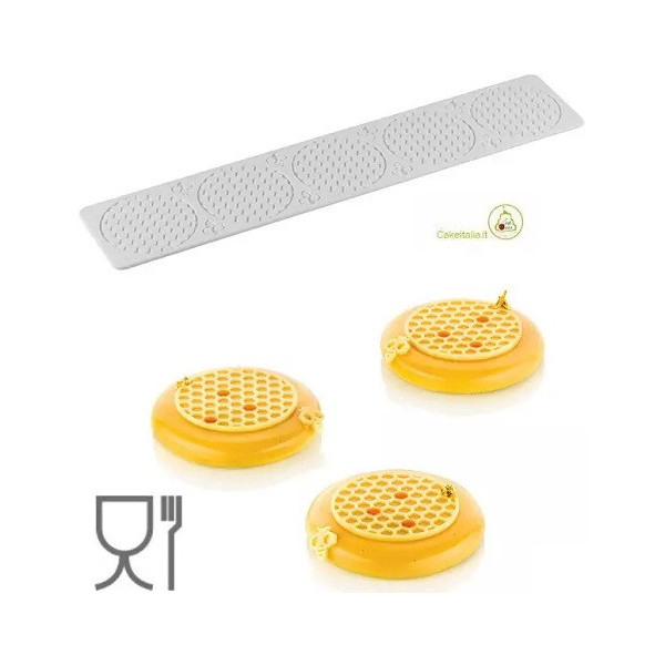 Alvéolé 9 Silikomart: tappetino decorativo in silicone professionale per decori tondi da 14 cm a trama con celle esagonali tipico dell'alveare + decoro fascia larga 4 cm + 10 decori ape.