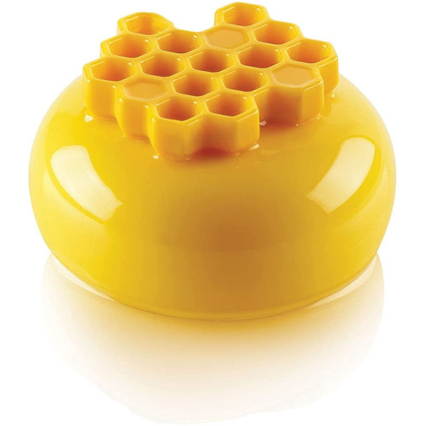 Lo Miel è uno stampo per decorare, monoporzioni o mini porzioni, in silicone bianco della linea Top White con cavità tonde per decori o texture a forma di alveoli esagonali di per mousse o cremosi.