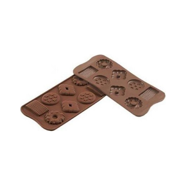 Stampo Choco Biscuit o cioccolatini Biscotto SCG25 da Silikomart: stampo in silicone marrone, con 8 cavità, un mix di forme dei classici biscotti.