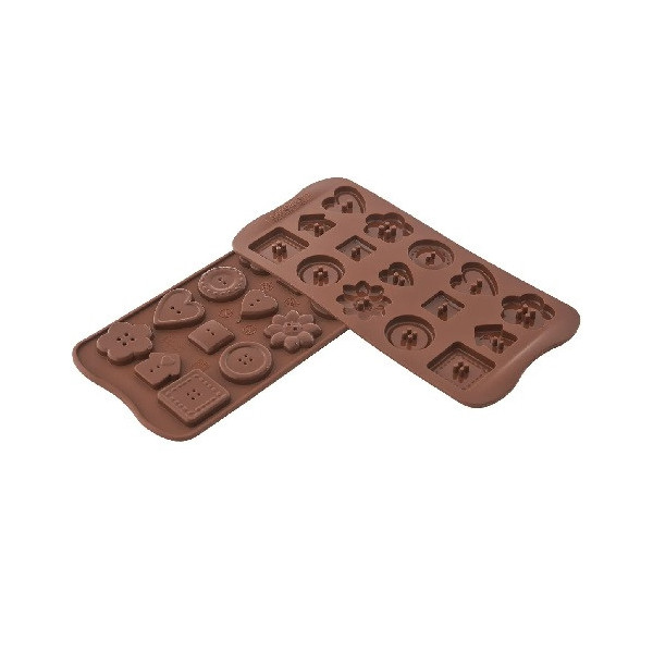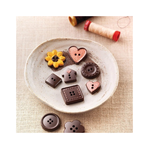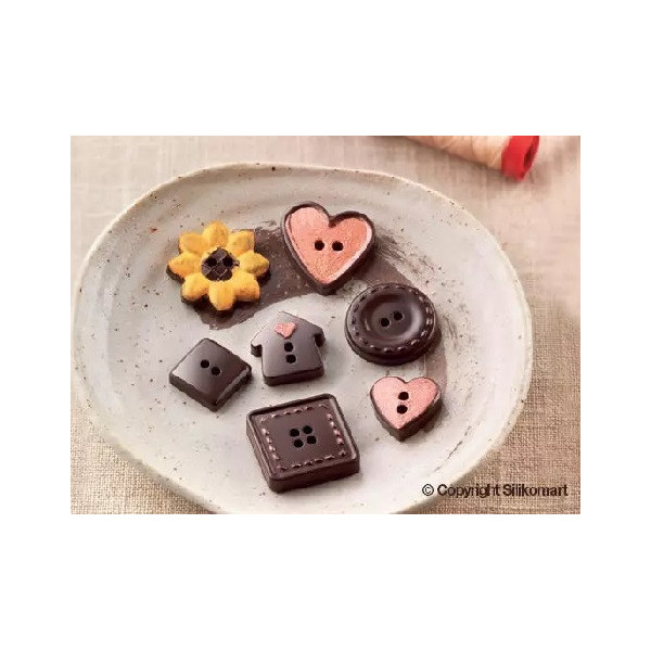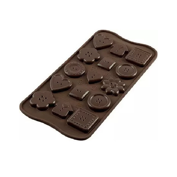 Stampo Choco Botton o cioccolatini Bottoni SCG25 da Silikomart: stampo in silicone marrone, con 15 cavità, un mix di forme dei classici bottoni.