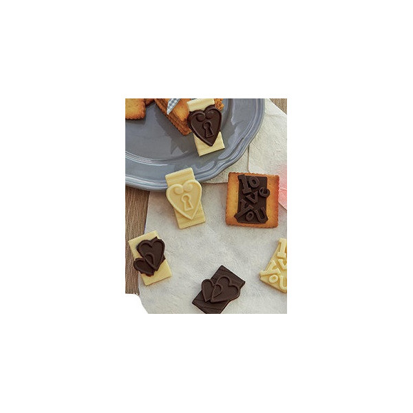 Stampo Cioccolatini Choco Tags in Love SF196 da Silikomart: stampo in silicone marrone per 16 Tag, alti 9 cm e peso 9 g circa, mix di scritte, cuori e altre forme ideali per dichiararsi,