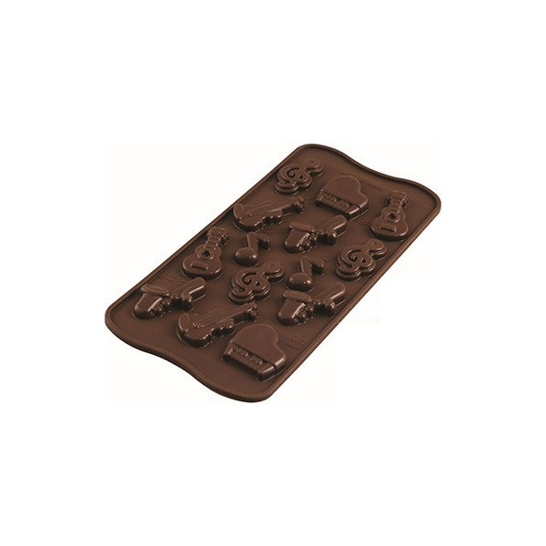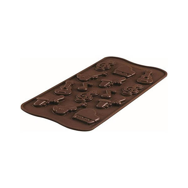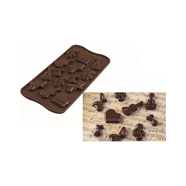 Lo stampo SilikoMart Choco Melody SCG43 è uno stampo per cioccolatini in silicone di deliziosi e graziosi cioccolatini a forma di strumenti musicali. Lo stampo presenta 14 cavità per cioccolatini ispirati alla musica. SilikoMart SCG043 linea EasyChoc. Adatto a preparare cioccolatini, gelatine, caramelle e ghiaccioli per bevande. Può essere utilizzato anche in forno e in freezer.