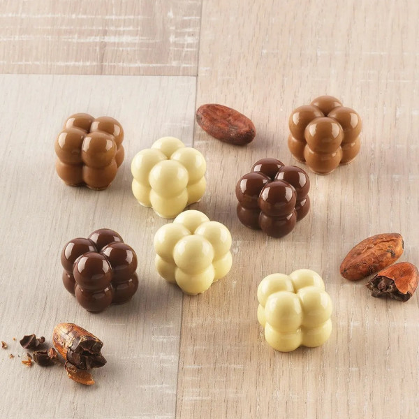 Stampo Cubetti di sfere tridimensionali per cioccolato in silicone vi permetterà di realizzare 15 cioccolatini a cubi Tridimensionali o Choco Game 3D nel modo più preciso. Ogni placca, contiene 15 cavità da 8 ml di dimensioni 112 mm x 240 mm x h 27 mm