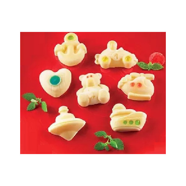 Stampo Sweet Baby stampo dolci mignon per Bambino di varie forme: bambino trottola trenino nave cuore orso macchina ancora rotex, in silicone flessibile e antiaderente.