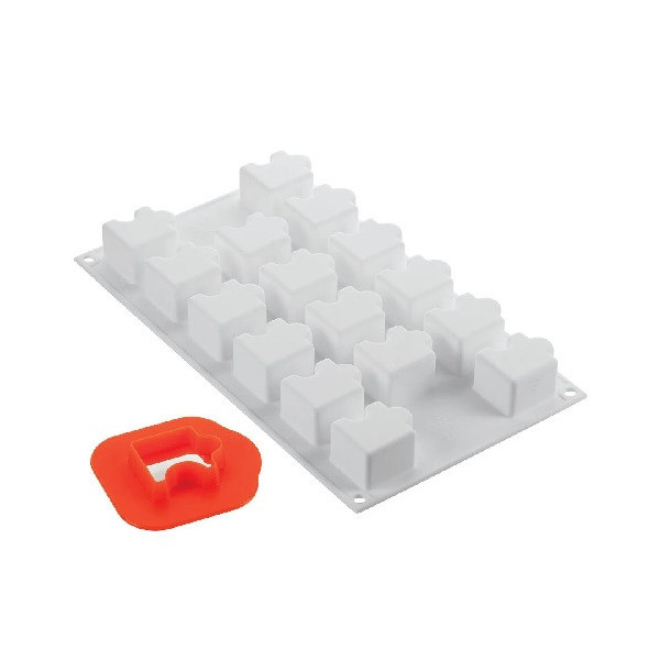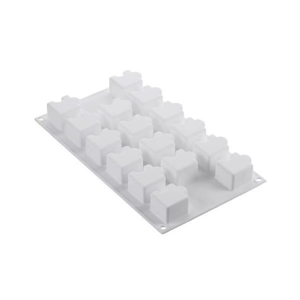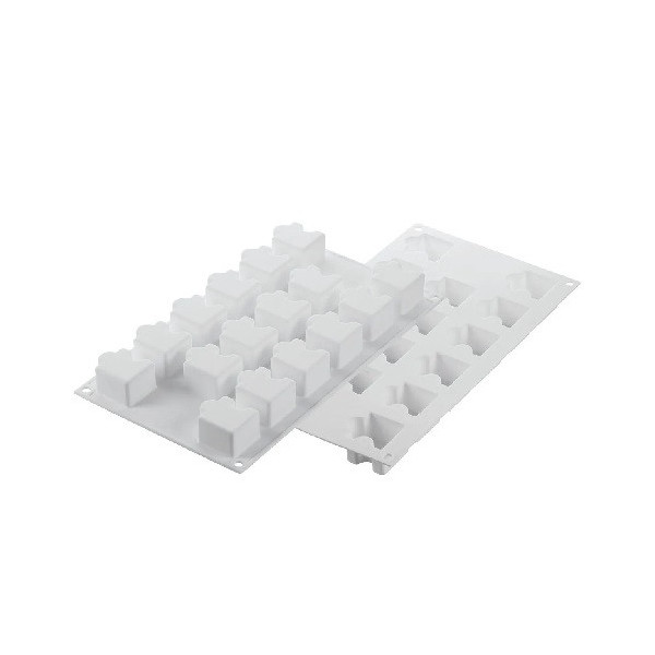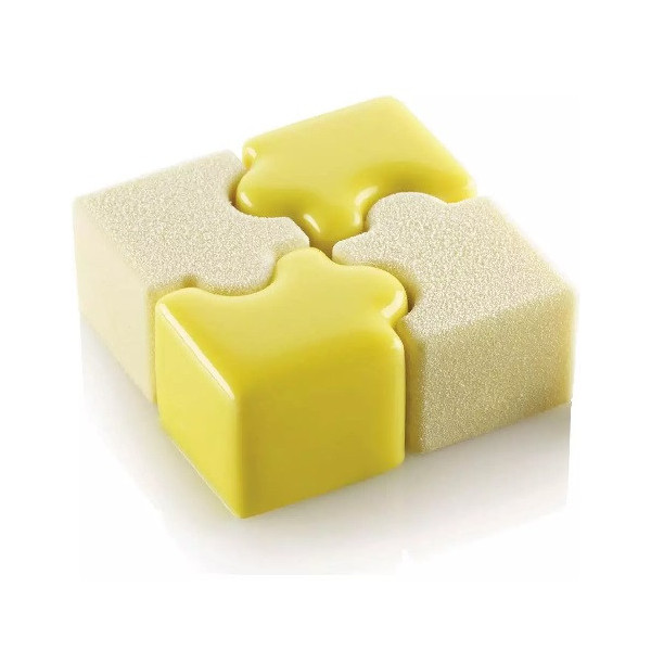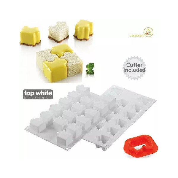 Puzzle 30 è uno stampo in silicone per 16 dolcetti a forma di tessere mignon di un puzzle, ogni cavità è da 32 ml, lunga 42 mm x 34 mm x h 28 mm, della linea Top White di Silikomart.