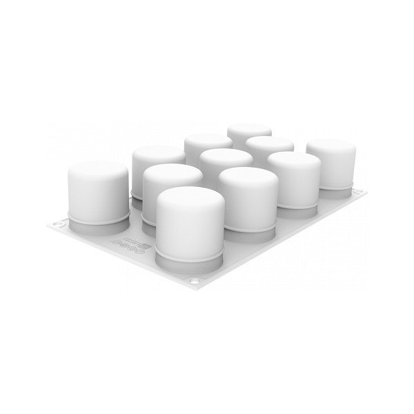Lo stampo Cilindri 3D 100, in silicone bianco, con 11 cavità a base tonda, da 5 cm x altezza 5m5 cm per realizzare monoporzioni sorprendenti.