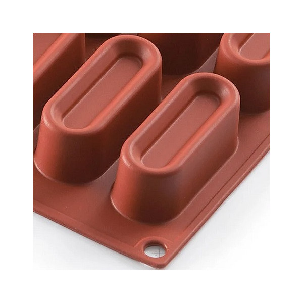 Stampo dessert ovali a forma allungata con incavo sul lato superiore in silicone flessibile e antiaderente realizzato in 100 % silicone liquido da Silikomart. Può essere messo direttamente dal forno al frigorifero e viceversa.