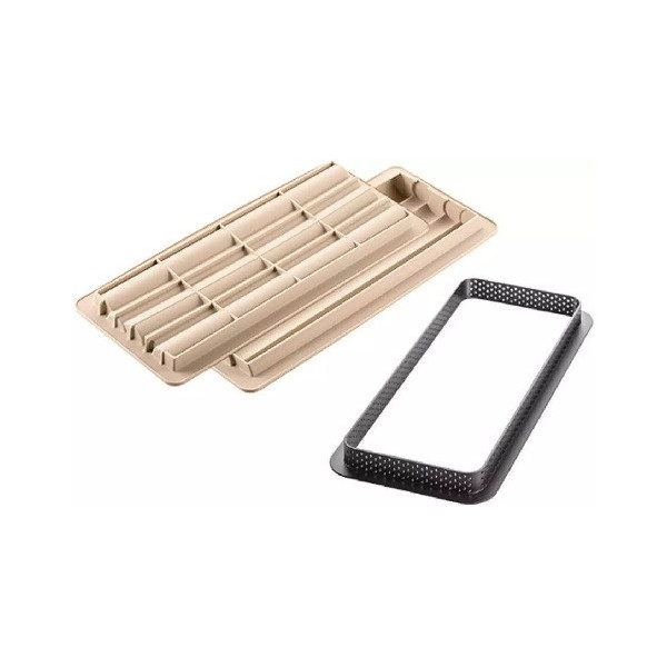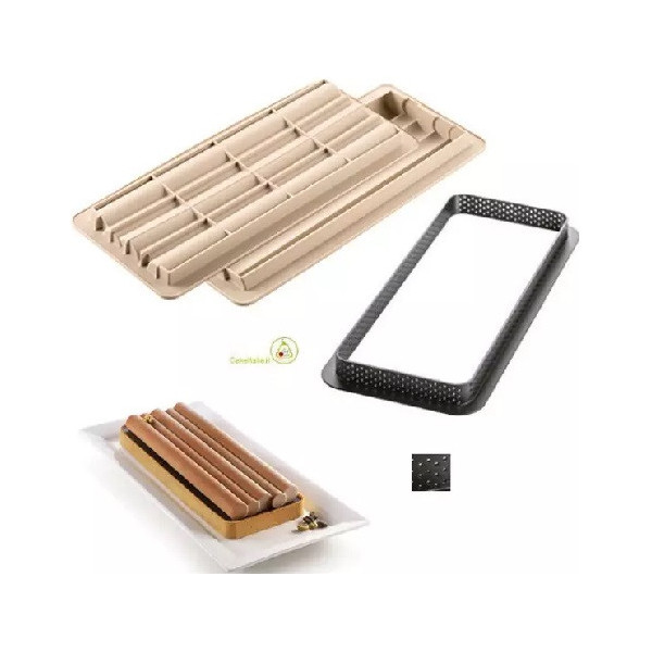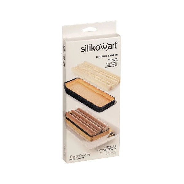 Kit Stampo Crostata Bambù o Kit Tarte Bamboo da Silikomart: 1 anello rettangolare da 265 mm x 105 mm h 2 cm per la base + 1 stampo in silicone da 25 cm x 9 cm h 20 mm per la decorazione a bambù