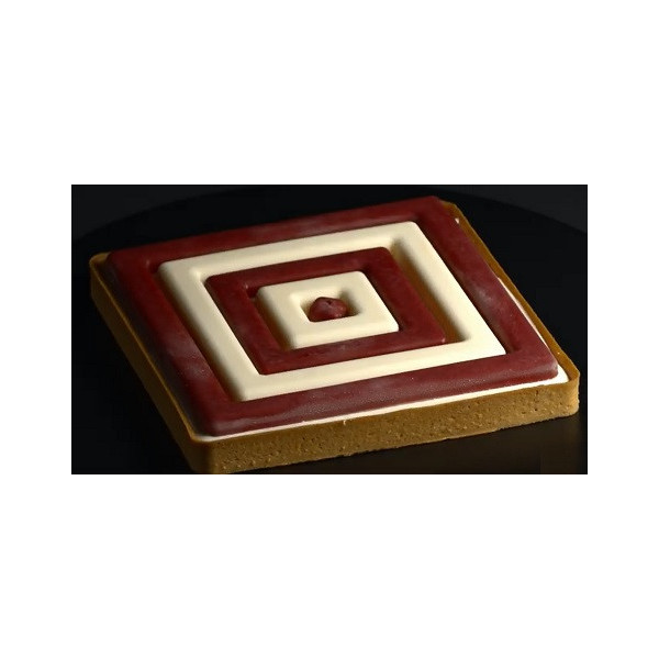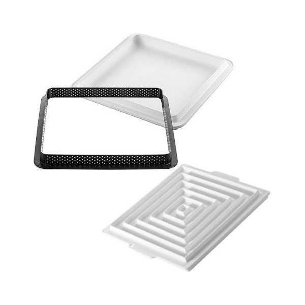Il Kit Square 200 Silikomart: stampo crostata quadrata decorata. Anello quadrato da 20 cm per la base più 1 stampo in silicone da 16 cm per mousse o cremoso più stampo decoro quadrato