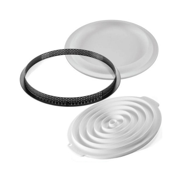 Kit Round 250 Silikomart: stampo crostata tonda decorata. Anello tondo da 25 cm per la base più 1 stampo in silicone da 20 cm per mousse o cremoso più stampo decoro tondo