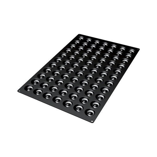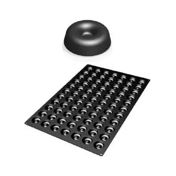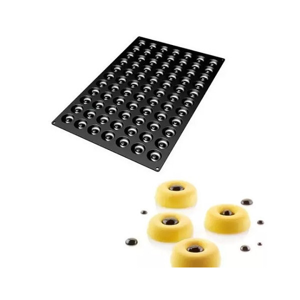 Stampo Sessantaquaranta per 77 mini savarin SQ033 in 100 % silicone liquido flessibile e antiaderente da Silikomart, teglia professionale per 77 savarin mini o mini babà francesi, di diametro 41 mm ed altezza 12 mm. Può essere messo direttamente dal forno al frigorifero e viceversa.