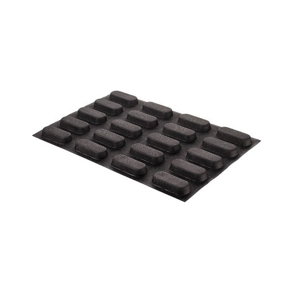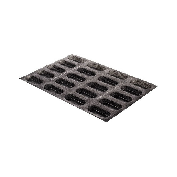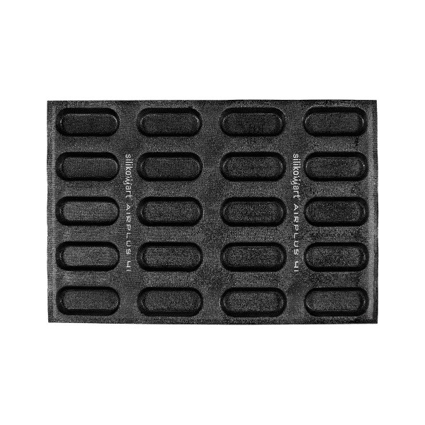 Mini Plumcake Air Plus 41 Silikomart: teglia di dimensioni 60x40, di colore nero, in silicone e fibra di vetro microforato, ideale stampo da forno per 20 mini baguette di dimensioni 12x5xh2 cm.