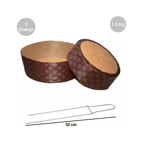 Il kit spillone 2 punte da 52 cm in acciaio inox da Decora, con 2 stampi panettoni bassi in carta cellulosa calandrata, usa e getta o monouso, da 1,5 Kg è composto da: