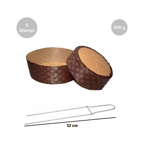 Il kit spillone a 2 punte, in acciaio lungo 52 cm con 5 stampi panettoni bassi in carta cellulosa calandrata, usa e getta o monouso, da 500 g è composto da: