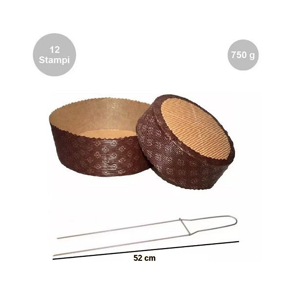 Set spillone in acciaio inox, a 2 punte, lungo 52 cm, di Decora, con 5 stampi panettoni artigianali bassi, stampi canasta o stampi panettoni gastronomici in carta cellulosa usa e getta o monouso da 750 g