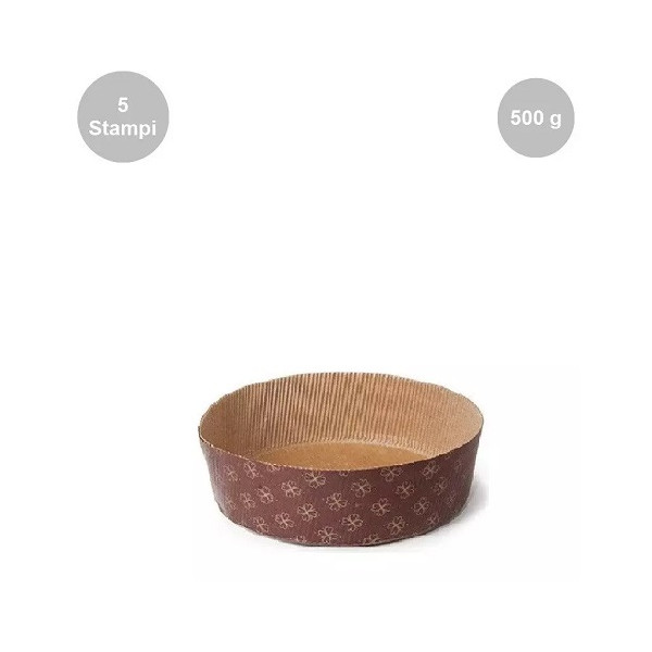 Caratteristiche set 5 stampi panettoni bassi in carta cellulosa calandrata, usa e getta o monouso, da 500 g: