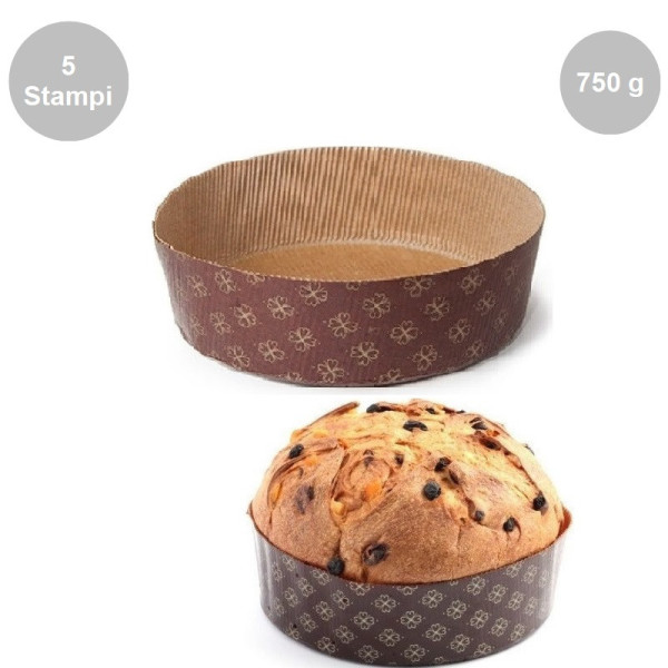 Caratteristiche set 5 stampi panettoni bassi in carta cellulosa calandrata, usa e getta o monouso, da 500 g: