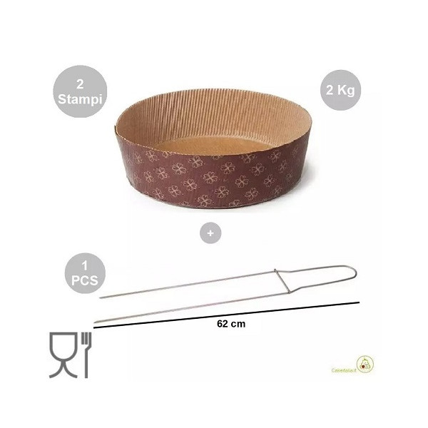 Il kit spillone da 2 punte, lungo 62 cm in acciaio inox da Decora, con 2 stampi panettoni bassi in carta cellulosa calandrata, usa e getta o monouso, da 2 Kg è composto da: