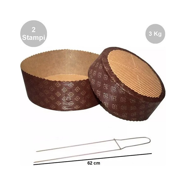 Il kit spillone a 2 punte, in acciaio inox da 62 cm, di Decora, con 2 stampi panettoni bassi in carta cellulosa calandrata, usa e getta o monouso, da 3 Kg è composto da: