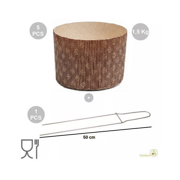 Set spillone da 50 cm in acciaio con 5 stampi panettone alto rigido, in carta cellulosa da 1500 g, è composto da: