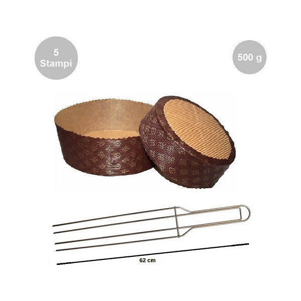 Set spillone 4 punte in acciaio lungo 62 cm, da Decora, con 5 stampi panettoni artigianali bassi, stampi canasta o stampi panettoni gastronomici in carta cellulosa usa e getta o monouso da 500 g