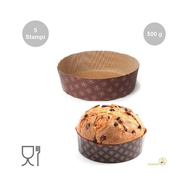Caratteristiche set 5 stampi panettoni bassi in carta cellulosa calandrata, usa e getta o monouso, da 500 g: