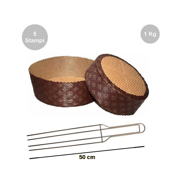 Il kit spillone 4 punte in acciaio da 50 cm con 5 stampi panettoni bassi in carta cellulosa calandrata, usa e getta o monouso, da 1 Kg è composto da: