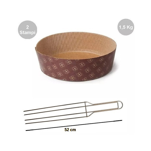 Set spillone 4 punte da 62 cm in acciaio con 2 stampi panettoni artigianali bassi, stampi canasta o stampi panettoni gastronomici in carta cellulosa usa e getta o monouso da 1,5 kg
