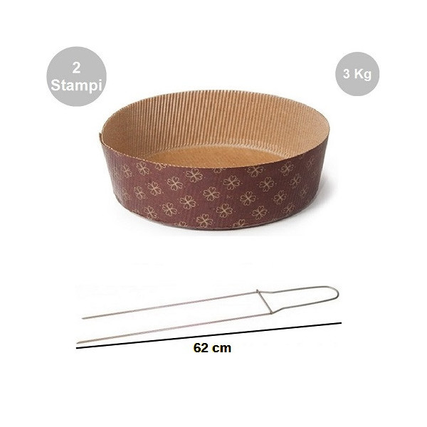 Il kit spillone 4 punte in acciaio da 62 cm con 2 stampi panettoni bassi in carta cellulosa calandrata, usa e getta o monouso, da 3 Kg è composto da: