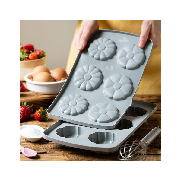 Duo Fiore Decora è un set di 2 stampi silicone accoppiabili con sei cavità ognuno a forma di fiore con profondità diverse.