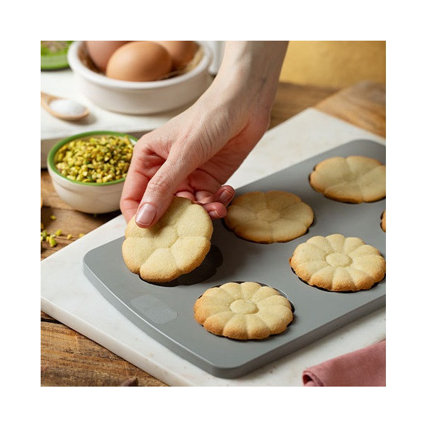 Duo Fiore Decora: set 2 stampi silicone accoppiabili per 6 fiori ø6,7xh2,3 cm. Coppia di stampi con 6 cavità a fiore e 2 profondità diverse, ideali per biscotti gelato, tavolette di cioccolato, barrette di frutta e cereali