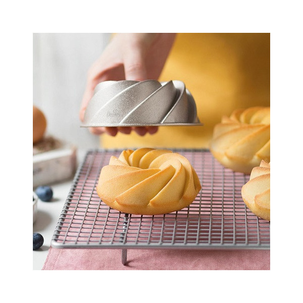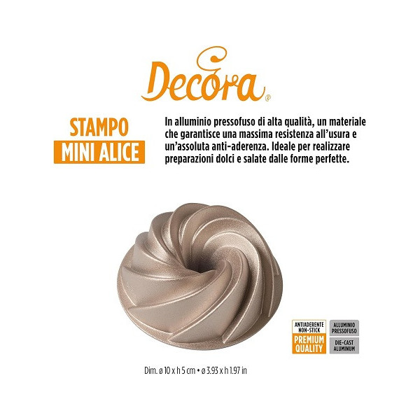 Mini Alice Decora: stampo in alluminio pressofuso antiaderente, color champagne di alta qualità per uso intensivo e professionale, stampo bundt cake, piccola ciambella da 10 cm x h 5 cm.