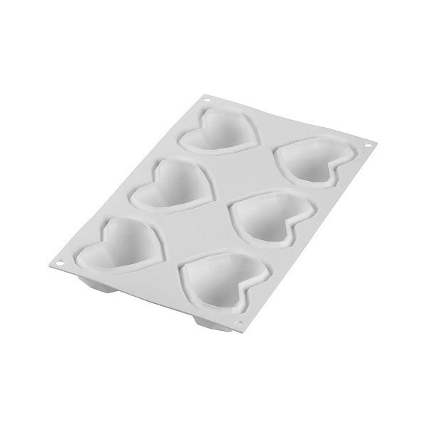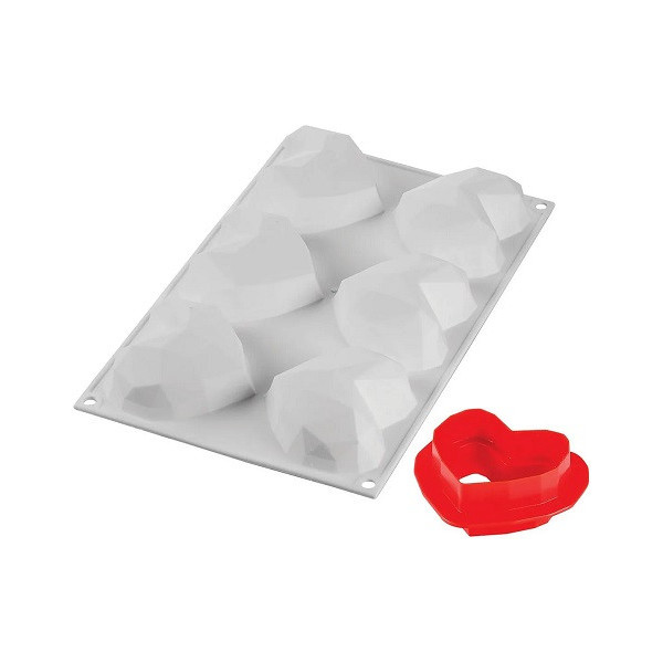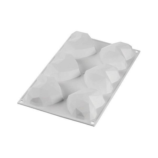 - 1 stampo in silicone con 6 cavità a cuore con decoro o trama sfaccettata da 8,4 cm x 7,4 cm x altezza 3,5 cm per realizzare monoporzioni a forma di cuore.