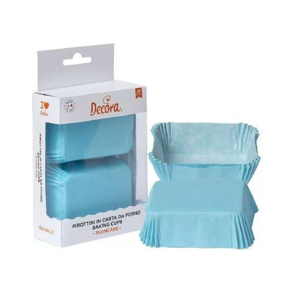 36 Pirottini azzurri per mini plum-cake in carta forno antiaderente, resistente fino a 220 °C, lunghi 8 cm, larghi 5 cm, alti 3,2 cm da Decora. Ideali per cuocere e presentare mini plum xake e dolcetti.