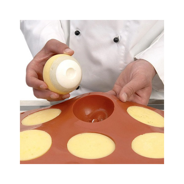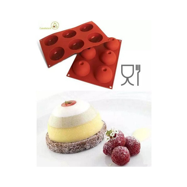 Stampo semisfera in silicone flessibile e antiaderente realizzato in 100 % silicone liquido da Silikomart. Può essere messo direttamente dal forno al frigorifero e viceversa.