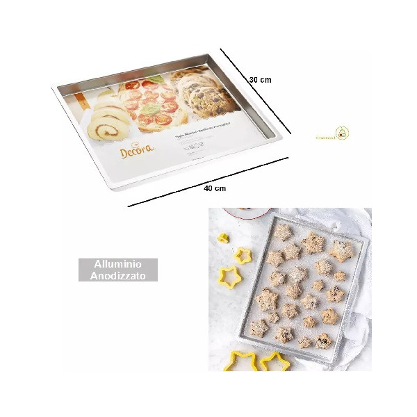 Teglia rettangolare bassa per biscotti e pizza da 17,8 a 30 cm Decora: teglia in alluminio anodizzato ad alta anti-aderenza, con guide laterali, ideale per biscotti, pan di spagna, dolci bassi e pizza.